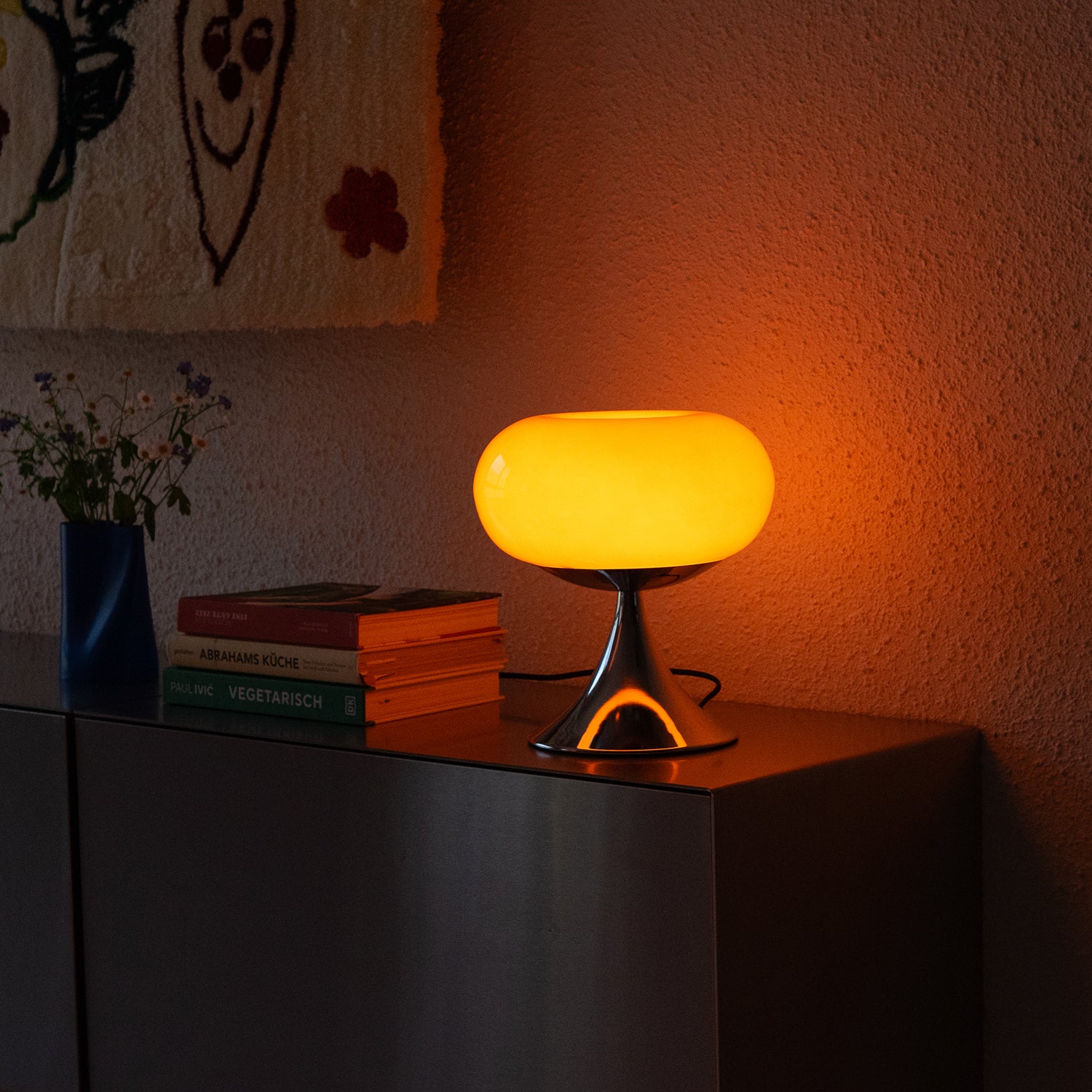 Eine Donut Lampe ist eine ikonische Tischlampe im Stil der 60er und 70er Jahre mit runder, organischer Form und warmem Stimmungslicht. Sie zählt zu den beliebtesten Designs im Mid-Century & Space-Age Look.